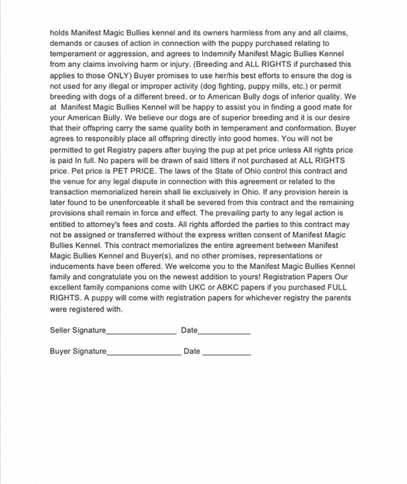 We will not Tolerate any Abuse. If it is brought to us and there is substantial evidence of abuse we will come directly to you. abuse can be an immediate repo of the dog?puppy that was purchased through MMBK (Manifest Magic Bullies Kennel).